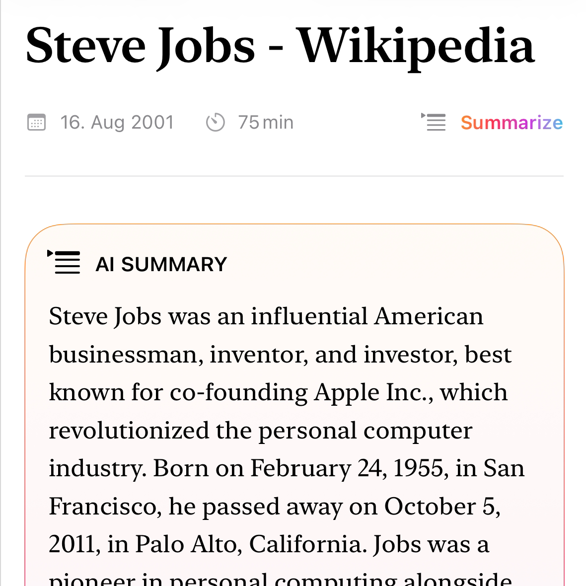 Generate concise summaries of long articles using Apple Intelligence. Summaries are created privately on your device and synced securely via iCloud.